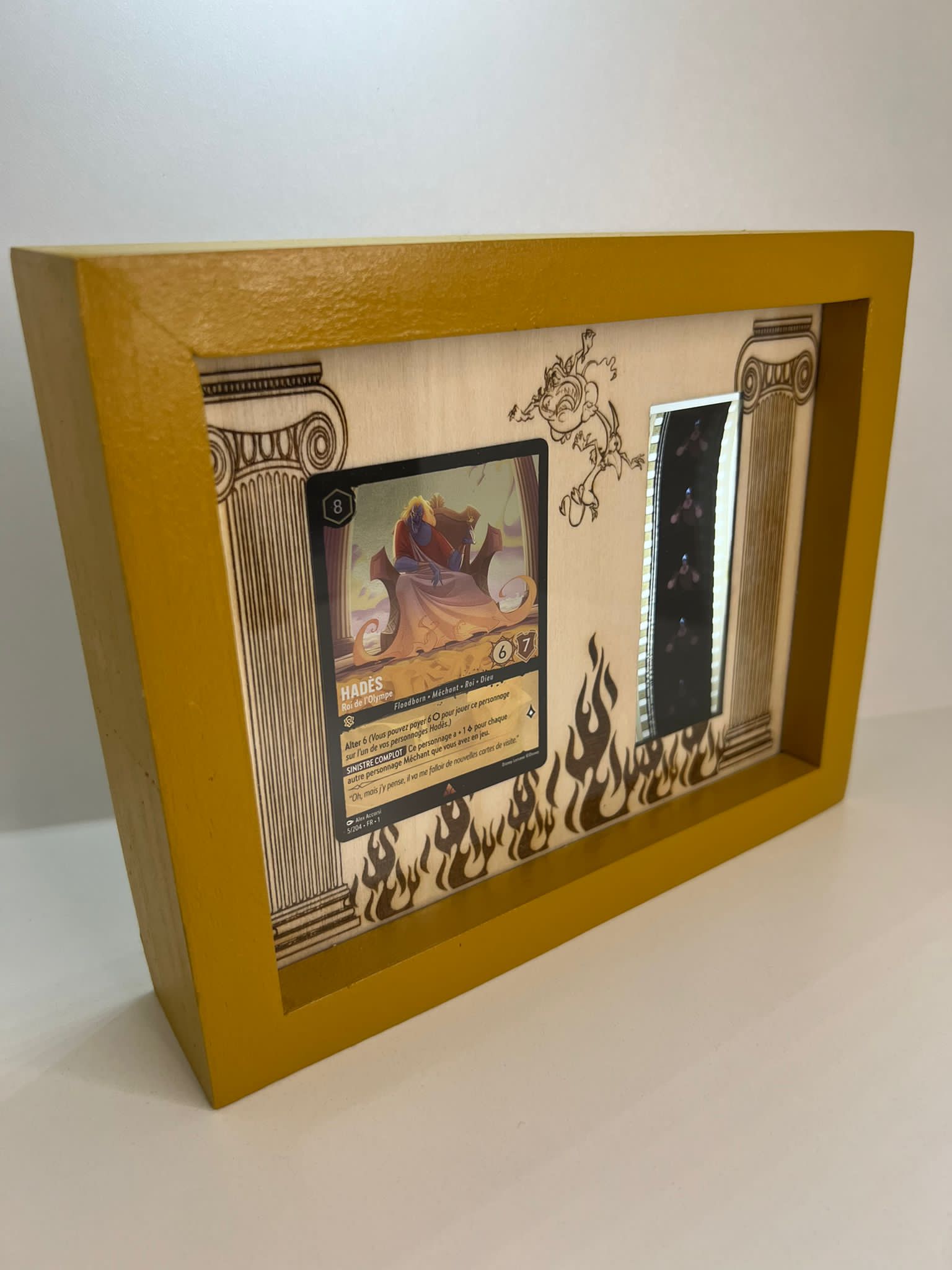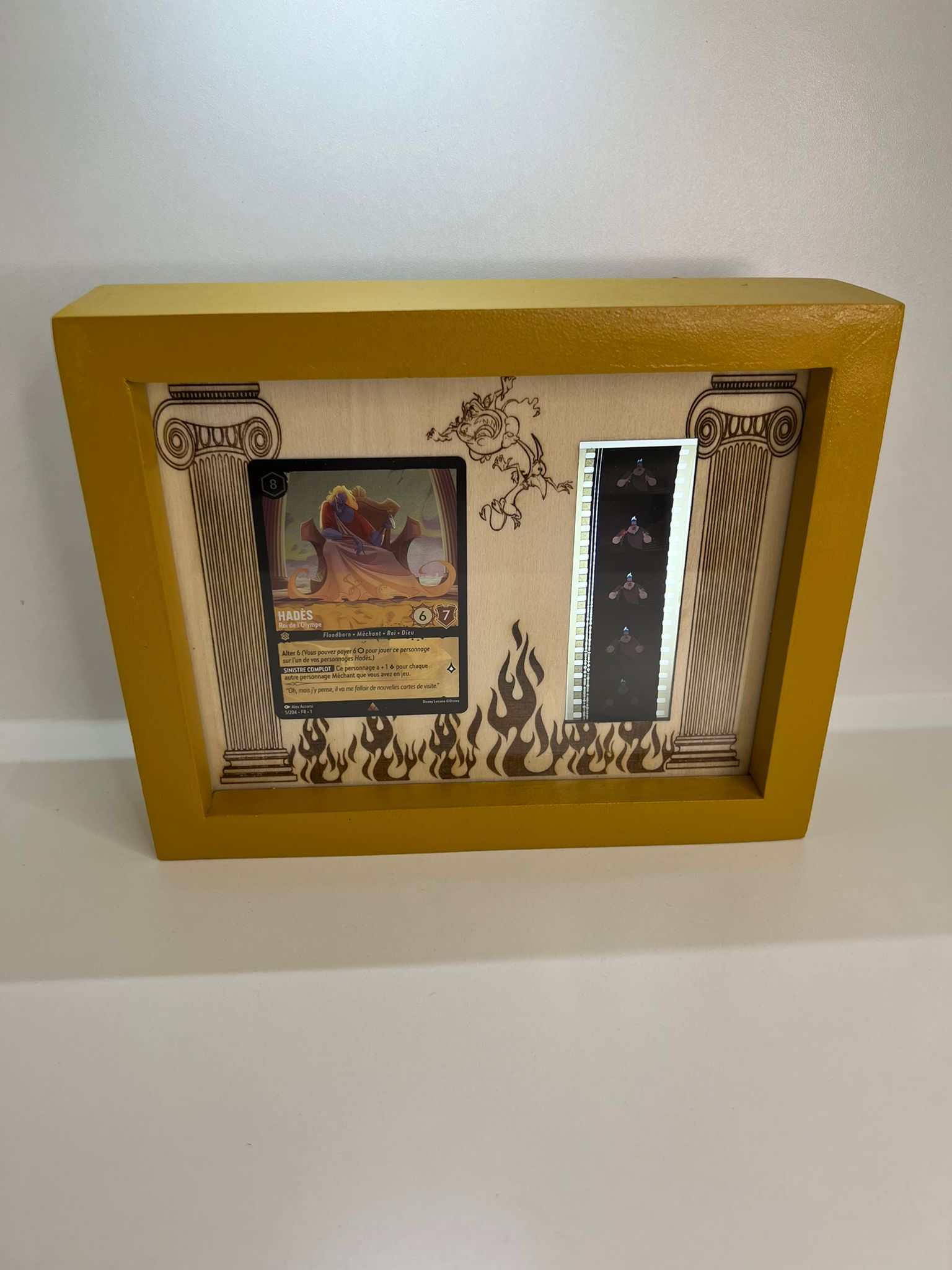 - Ce cadre en bois fabriqué artisanalement met en valeur un fragment authentique de pellicule du film Hercule de Disney, accompagné d’une carte thématique.