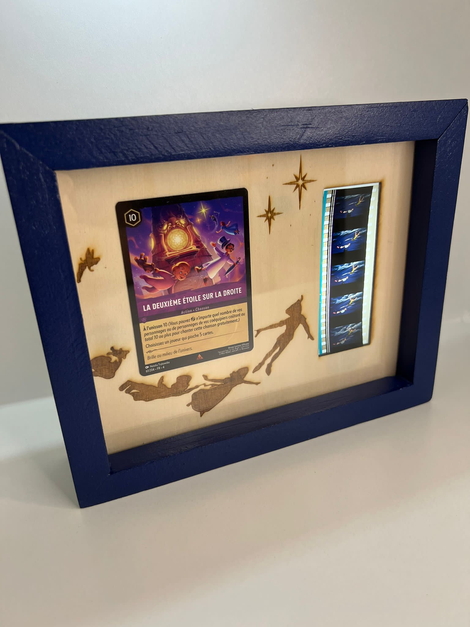 - Ce cadre en bois, fabriqué artisanalement, met en valeur un authentique morceau de pellicule de film Disney, extrait de Peter Pan, accompagné d’une carte thématique.