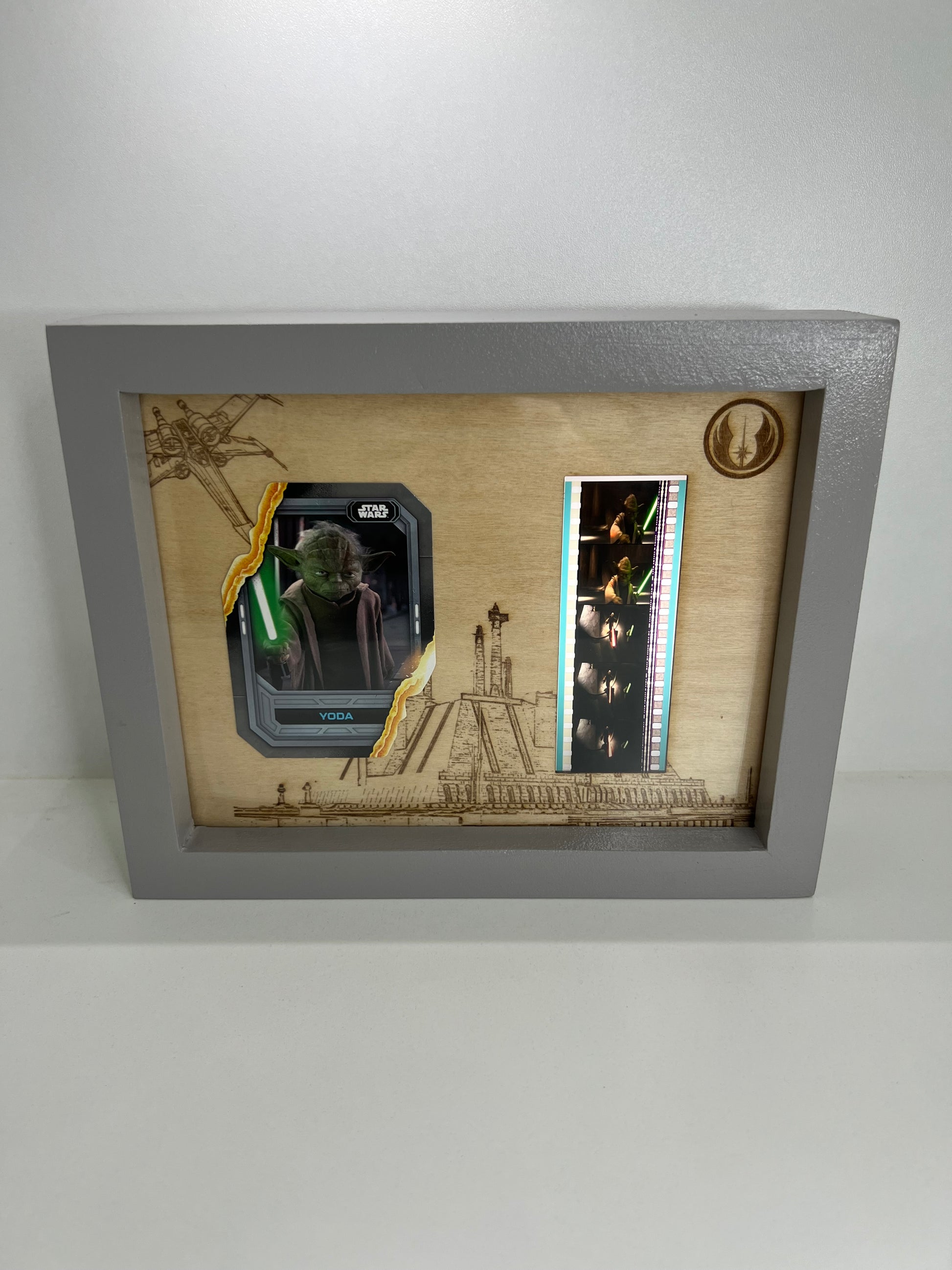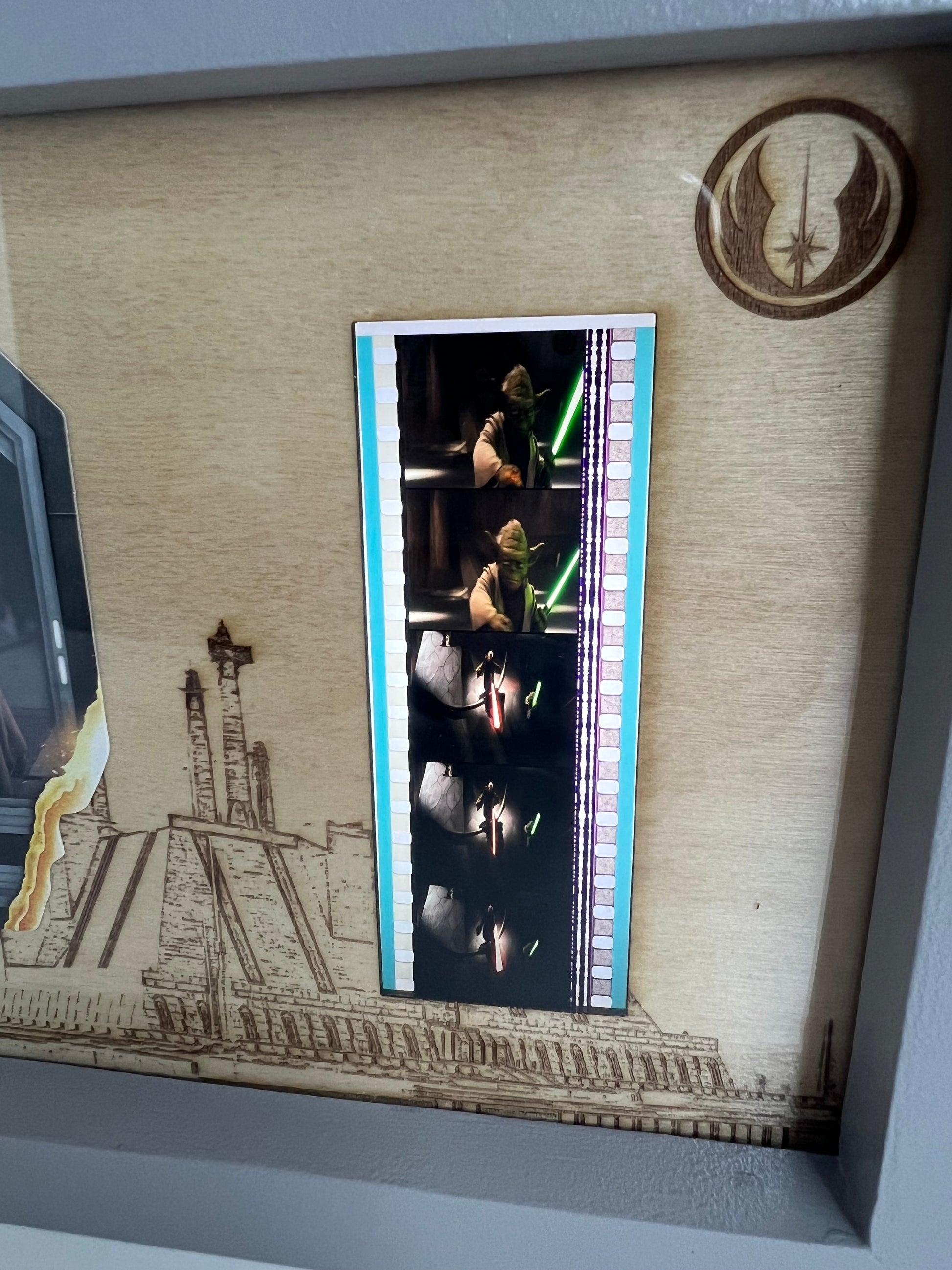 - Ce cadre en bois artisanal met en valeur un morceau authentique de pellicule du film Star Wars.